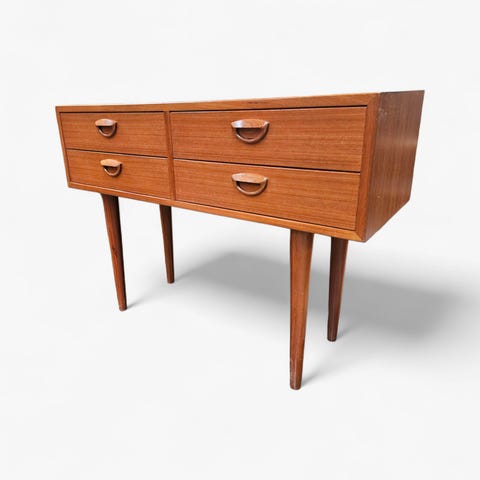 Flot vintage kommode i teaktræ fra midcentury. Grebene minder om fdb design fra Poul volther og kommoden har flot buet front. Fremstår i fin stand med aldersrelaterede brugsspor