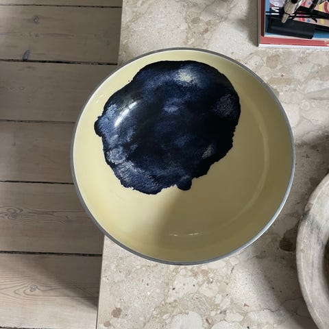 Stelton skål med integrerede lysestager i kombination af glas og metal. Skålen er placeret på en metalring med flere lysholdere rundt i kanten, som kan bruges til fyrfadslys eller små stearinlys. Velegnet som dekoration på bord eller skænk, fx som frugtskål eller til dekorationer, hvor lysholderne kan tændes omkring skålen.