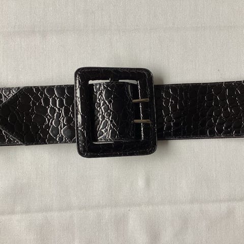 Ubrugt brun Bælte med mønstret overflade. Bæltet har rektangulært spænde og bæltestrop i samme materiale og mønster. Indersiden er sort. Længden fremgår af billederne med målebånd. Velegnet til både bukser og nederdele for unisex brugere. Inderste hul 67 cm. og yderste 82 cm. Længde i alt 90 cm. Brede 2 cm. Se alle fotos. Sælges for 60 kr.
