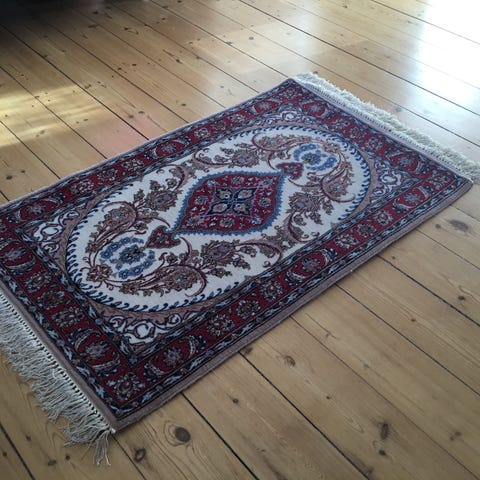 Jeg sælger et ægte, håndlavet iransk silketæppe, som jeg har arvet fra min familie. Tæppet er lavet af høj kvalitet silke og er et unikt kunsthåndværk med fine detaljer og traditionelt persisk mønster.