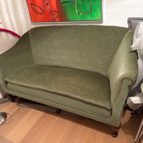 Gl. sofa, ombetrukket, udskæring med bladguld, fin stand.