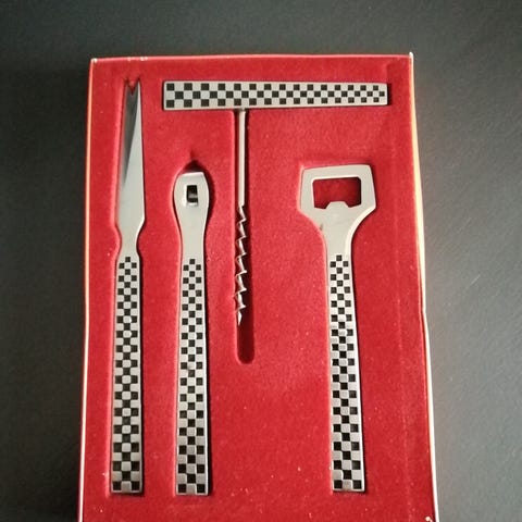 Rustfrit stål, Barsæt, New Craft Fashion, Retro barsæt i tre dele: proptrækker, oplukker og istang. Fremstillet i rustfrit stål og palisander. Fremstår i pæn stand.