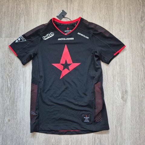 Hummel Astralis herre sportstrøje i størrelse M. Trøjen er kortærmet og i blå nuancer med grafisk mønster og Astralis-logo på fronten. Rund hals med rød kant og Hummels karakteristiske vinkler på skuldrene. Egnet som sportstrøje eller fritids-T-shirt.