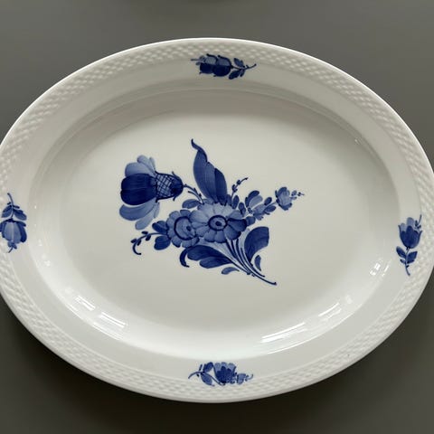 Smukt fad fra serien Blå Blomst fra Royal Copenhagen. Nr 8012. Fadet er 1. Sortering, men det er gammelt, så der er et par små glasurnistrer. Det er intakt uden skål eller revner og måler Ø 34 cm