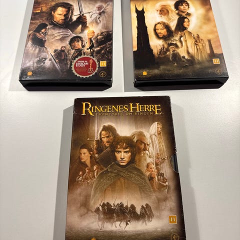 Ringenes Herre trilogi DVD boks. Indeholder de tre film i Ringenes Herre-serien samlet i en boks. Hver film er på DVD i individuel æske med dansk titel på omslaget. Velegnet til afspilning på standard DVD-afspillere, der understøtter det relevante regionskodeformat. Oplysninger om lydspor, undertekster og ekstra materiale fremgår af de enkelte DVD-omslag.