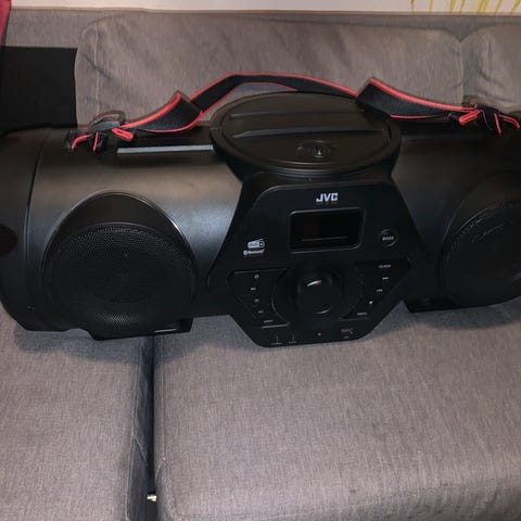 2 JVC boombox med cd-afspiller og usb. Enheden har indbygget frontmonterede højttalere og bærehåndtag til nem transport. Betjeningsknapper og display er placeret cd på toppen, og usb port.