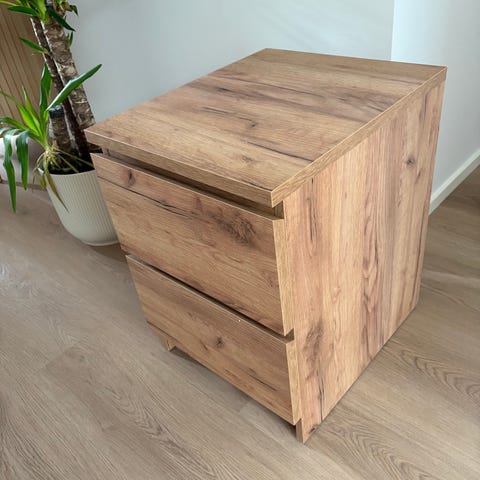 Sælger 2 stk. LIMFJORDEN sengeborde med 2 skuffer i lys egefarve.
