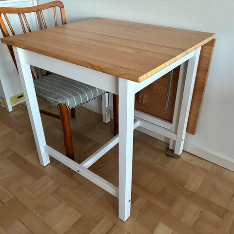 IKEA klapbord spisebord i træ med rektangulær bordplade og to ovale klapper i hver ende. Bordet har lys træbordplade med synlig årestruktur og knaster samt lyse ben. Klapfunktionen gør det muligt at bruge bordet både som kompakt bord og som større spisebord efter behov. Velegnet til køkken eller mindre spiseområde, hvor der er brug for fleksibel bordplads.