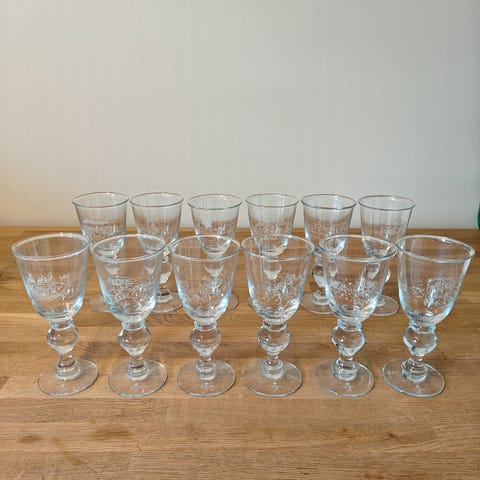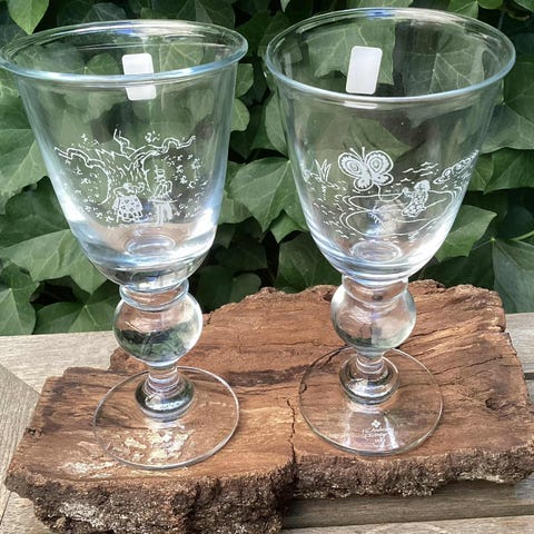 7. Stk. Holmegaard H.C. Andersen vinglas i klart glas med indgraverede motiver inspireret af H.C. Andersens eventyr. Glassene har kraftig fod med rund knop.