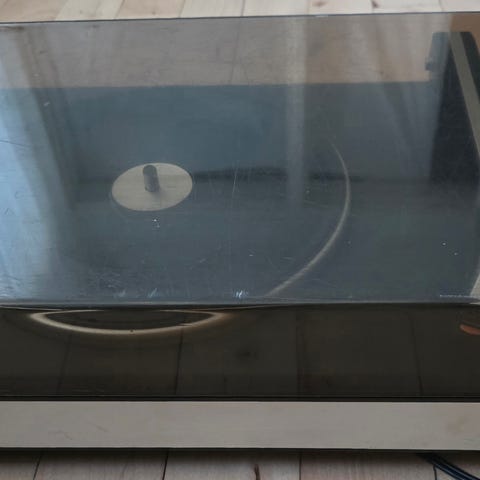 Anlægget står flot og originalt. Støvlåget er intakt med de forventelige brugsspor fra tidens tand, men selve fronten og knapperne fremstår meget velholdte.