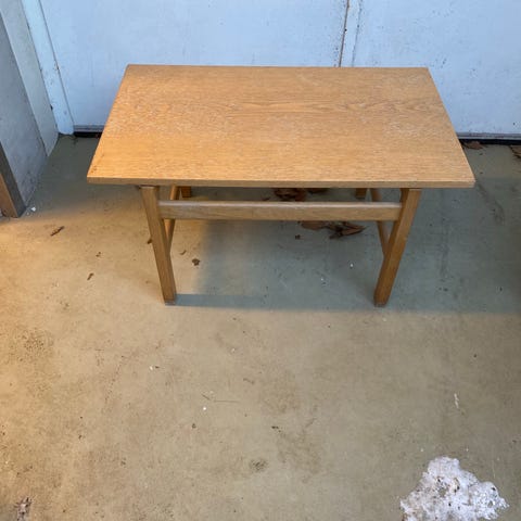Hans J. Wegner sofabord i lyst bøg Bordet har rektangulær bordplade og lige ben. Overfladen fremstår i lyst fineret træ med synlig årestruktur. Velegnet som sofabord eller sidebord i stue eller opholdsrum. Designet af Hans J. Wegner for Getama, som angivet på mærkaten under bordpladen.