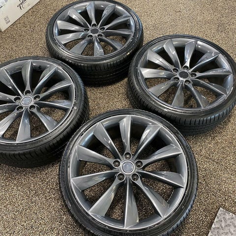 Sælger et sæt 4 originale 21” Turbine fælge i grå, som passer til Tesla Model S.
