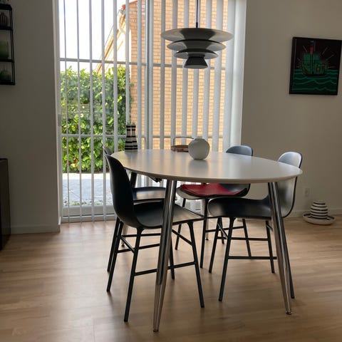 Hvidt spisebord med lyse træben. Enkelte støtte kanter på spisebordet.