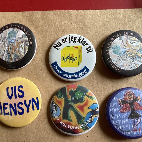 Blandet parti ældre badges i metal med nålelukning på bagsiden. Motiverne omfatter blandt andet danske reklamebudskaber, politiske og sociale kampagner samt humoristiske illustrationer. Flere badges har tekst og logoer fra fx supermarkedskæder, energikampagner og andre danske mærkesager. Forskellige størrelser og farver.