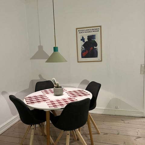 Dinning table with 4 chairs (one is not shown in the picture). Table dimension: 79* 119 cm but it can be extended on both sides and adds 50 cm on each side.