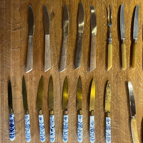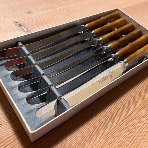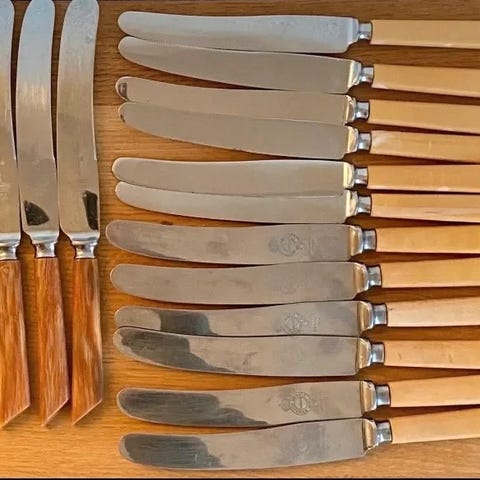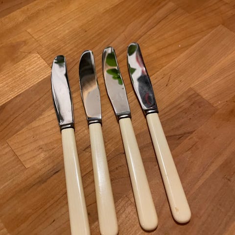 Sheffield bestikknive med brune skæfter i plast og blade i rustfrit stål. Længde 21