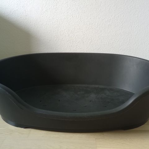 Hundeseng med metalramme og mørk stofpude. Rammen er udført i metal med buet gavl og sider. Puden er tyk og blød med aftageligt betræk i mørk farve. Egnet som liggeplads til mellemstore kæledyr indendørs.