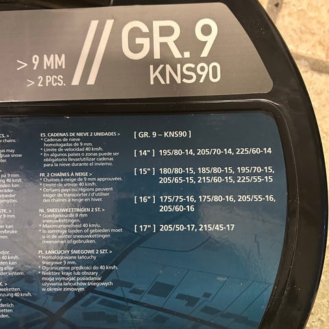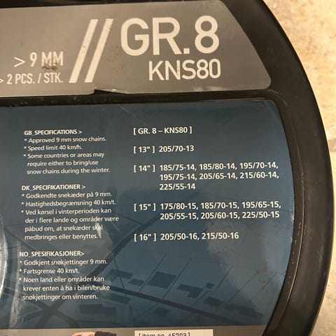 Raze GR.11 KNS110 snekæder leveres i en plastkuffert og er beregnet til montering på bilhjul. Modellen er angivet som GR.11 med typebetegnelsen KNS110. Snekæderne er udformet til at give øget vejgreb på sne- og isbelagte veje. På emballagen findes en liste over kompatible dækmål samt illustrationer af monteringsprocessen. Produktet er egnet til brug i vinterforhold, hvor der er behov for ekstra trækkraft og stabilitet på glatte underlag.