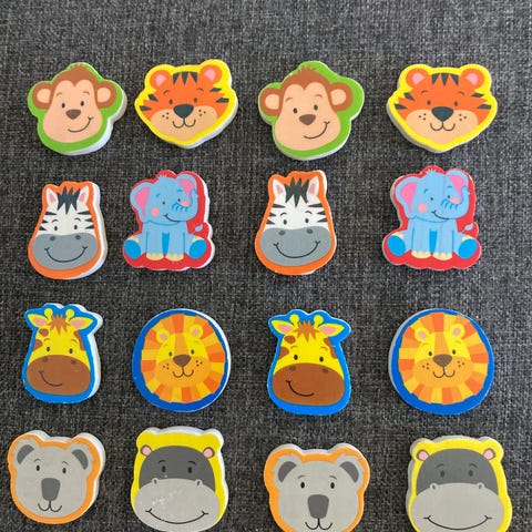 Forskellige viskelædere i forskellige motiver og farver. Sættet indeholder flere små viskelædere med figurer og temaer inspireret af Disney-universet samt andre motiver. Egnet til brug i penalhuset, til legetegninger eller som samlerobjekter for børn, der kan lide farverige skriveartikler med figurmønstre.
