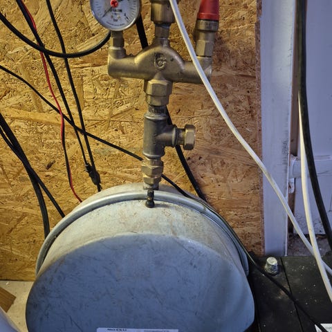 Ventilen er justerbar og står pt. indstillet til 1,5 bar, hvilket er standard for mange private varmeanlæg. Manometeret er et originalt Caleffi by WIKA.
