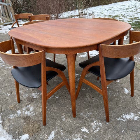 Vintage flot spisebord i teak (ø110) og flotte Erik Buch stole