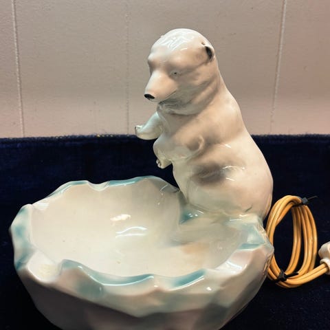 46 Rigtig fin ozonlampe af isbjørn med fatning og pærer sælges for 250,00 kr. Den er 12,5 cm høj, 22,5 cm lang og 8,5 cm bred. Fremstår hel og fin uden afslag.