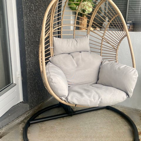 Hængestol æggeformet med stativ flet natur med lyse hynder