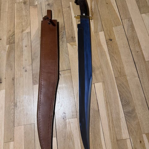 Dekorativt sværd med tilhørende skede. Sværdet har bred klinge i metal med mønster og lige parerstang med udsmykning i metal. Håndtaget er beklædt med sort materiale, formentlig læder eller kunstlæder, med metalbeslag ved pommel og parerstang. Skeden er sort, formentlig i læder eller kunstlæder, med metalbeslag og dekoration i enderne. Velegnet som pynt, samlerobjekt eller rekvisit til udklædning og rollespil. Sender gerne men sender med gls så derfor intet fix færdig for det har gls ikke.