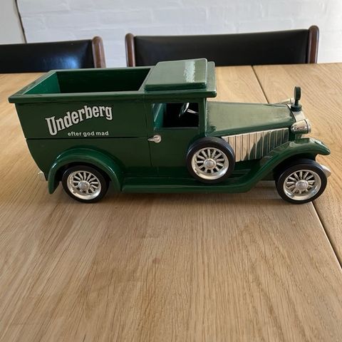Underberg model lastbil med anhænger i grøn farve. Lastbilen er udført som en klassisk varevogn med tilhørende trailer, begge med Underberg-logo på siderne. Modellen har detaljerede hjul og kromfarvede elementer ved fronten. Egnet som samlerobjekt eller dekoration, for eksempel på hylde, vindueskarm eller barområde.