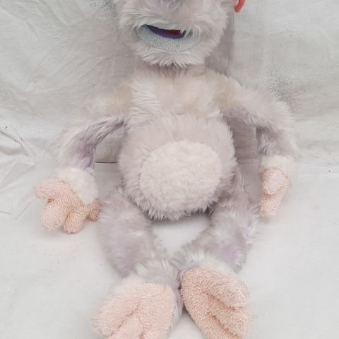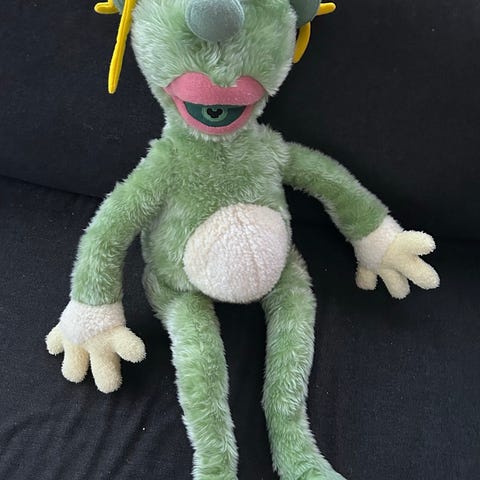 Stor grøn bamse som plysdyr med lange ben og arme. Figuren har lys mave, hænder og fødder samt gult hår og markant næse. Blød plys egnet som krammebamse eller dekoration på børneværelse.