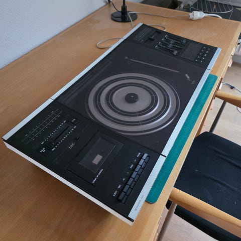 Beocenter 5000 Pladespiller, bånd, radio. Med tilhørende højttalere. Anlæget starter op men spiller kun kortvarigt, så slukker den igen. Derfor reperation påkrævet. Pris samlet med højttaler