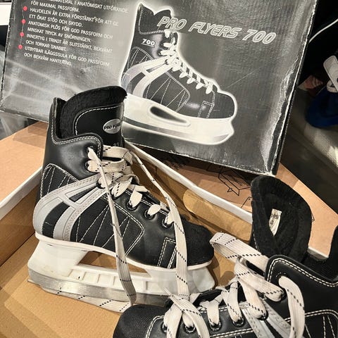 Ranger 212 ishockeyskøjter i størrelse 37. Skøjterne er sorte med lyse detaljer og hvide snørebånd. De har fast hælkappe og polstret skaft for støtte omkring anklen. Understål i metal med hvid holder, egnet til ishockeybrug på isbaner. Velegnet til børn med skostørrelse 37, der skal bruge skøjter til ishockey eller generel skøjteløb på is. Sålen i støvlen måler 24 cm.