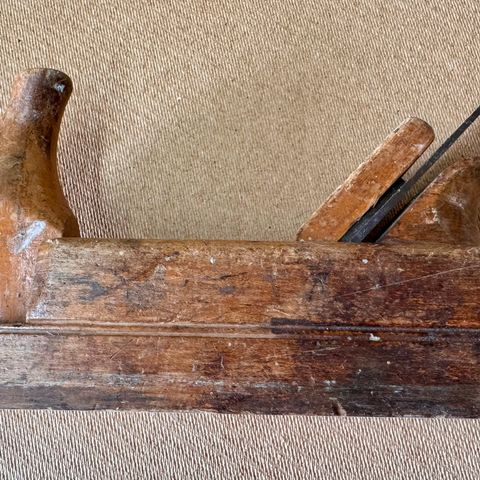 Træhøvl med messingbeslag. Høvlen er udført i træ med indsat jernblad og har påskruede messingbeslag på siden og undersiden. Værktøjet er velegnet til træbearbejdning og kan bruges til profilering eller finpudsning af kanter og lister. Kan sendes med DAO: kr. 45