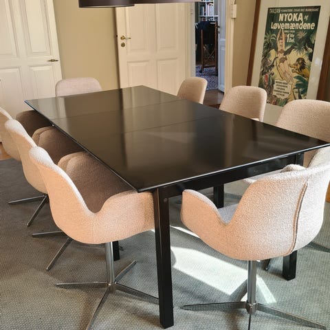 Sort solidt vintage spisebord fra 1920’erne. Bordet er sammenklappet 105cm bredt og 140cm langt, men kan til selskaber udvides til hhv. 105*192cm, 105*244cm og 105*296cm ved hjælp af 3 medfølgende tillægsplader. Bordet er restaureret professionelt og LUX LAK (luxlak.dk) har påført en moderne sort silkemat lak, der er meget slidstærk. Bordet fremstår meget flot og der er kun en mindre skramme på bordkanten samt lidt slid på ben. Se fotos. Bordet er i tung stærk kvalitet, men meget simpelt at skille ad