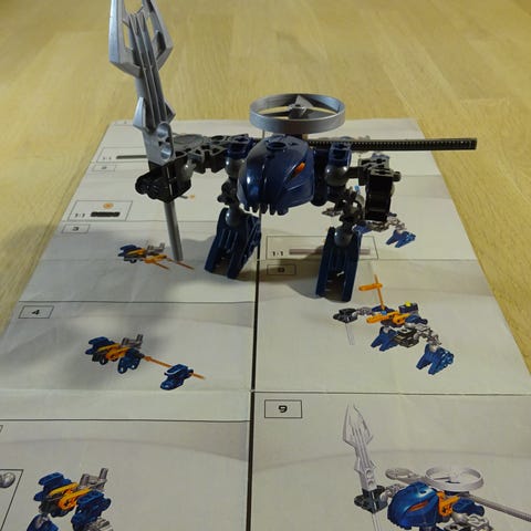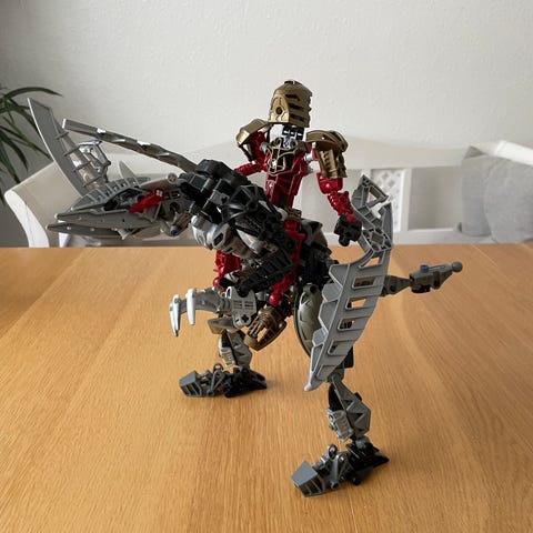 LEGO Bionicle 8568. Sættet består af en samlbar Bionicle-figur i brune, sølvfarvede og beige nuancer med bevægelige led og våben i hænderne. Figuren leveres i original Bionicle-beholder samt med tilhørende byggevejledning, som vist på billederne. Velegnet til leg, samling eller som del af en LEGO Bionicle-samling.