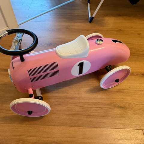 Magni løbecar legetøjsbil i sølvfarvet metal med sorte plastikhjul og sort sæde. Bilen har rat til styring og nummer 1 på sider og front. Egnet som køretøj til mindre børn, der kan skubbe sig frem med benene, og kan bruges indendørs på jævne gulve.