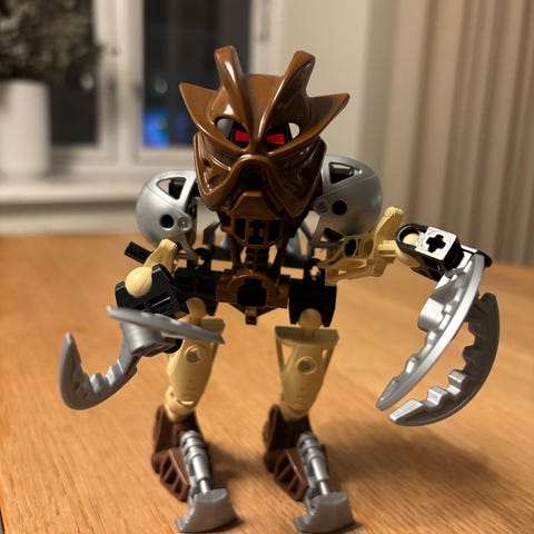 LEGO Bionicle Gali figur 8533. Sættet består af en blå Bionicle-figur med bevægelige led og våbenarm. Leveres i original Bionicle-beholder med tilhørende instruktionshæfte, som vist på billederne. Velegnet som samlerobjekt eller til leg med Bionicle-universet.