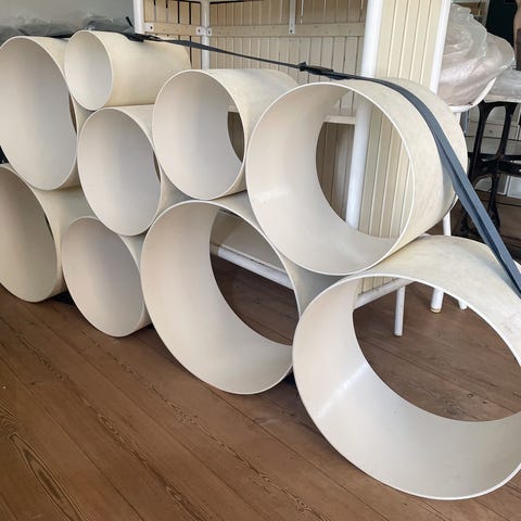 The futuristic Oto 100 storage system consists of eight fibreglass cylinders that provide convenient storage space for books and magazines but can also be used to store and display other interior decorating items.