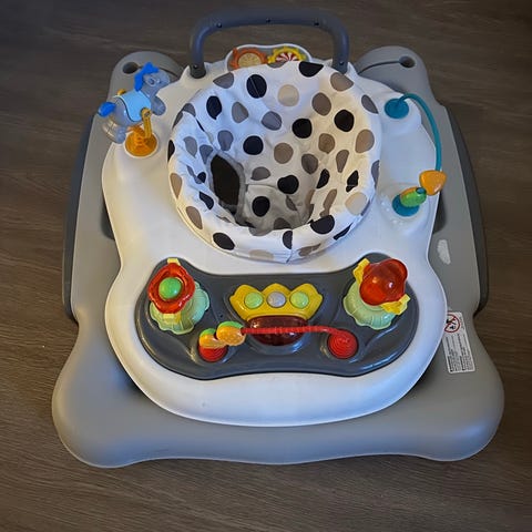 Gåvognen er i sort og hvid med et komfortabelt, polstret sæde og en høj ryg for ekstra støtte til barnet. Den har et integreret aktivitetsbord med mange farverige knapper og drejeelementer, som stimulerer barnets sanser og hjælper med finmotorikken. Vognen er designet til indendørs brug på jævne gulve og er velegnet til børn, der kan sidde selv og er ved at øve sig i at gå. Produktet er købt i Buddy.