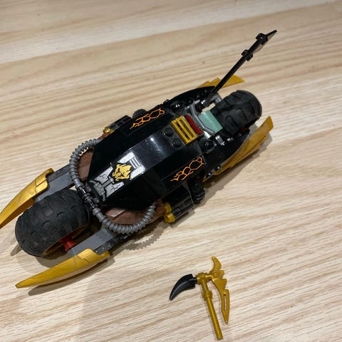 LEGO Ninjago Dragons Rising byggesæt med motorcykel. Sættet indeholder dele til at bygge en ninja-motorcykel med blå og hvide elementer samt tilhørende minifigur. Egnet.