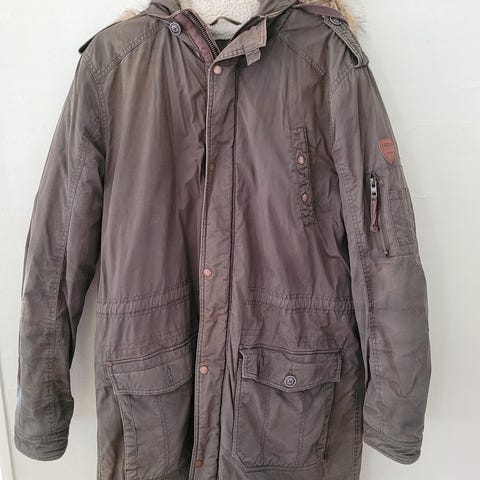 AllSaints vinterjakke til mænd i størrelse M. Jakken er fremstillet i polyamid og angives i farven sølv. Modellen er en kraftig, vatteret vinterjakke med hætte og gennemgående lynlås foran. Den har sidelommer med lynlås og AllSaints-logo på brystet. Velegnet som yderjakke i den kolde sæson.