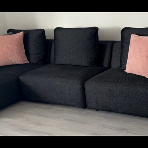 Sofaen består af et midtermodul og venstrevendt chaiselong i hvidt stofbetræk og er i koldskum.