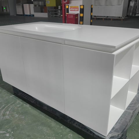 Corian bordplade med vask, i farven Glacier White, til badeværelse.