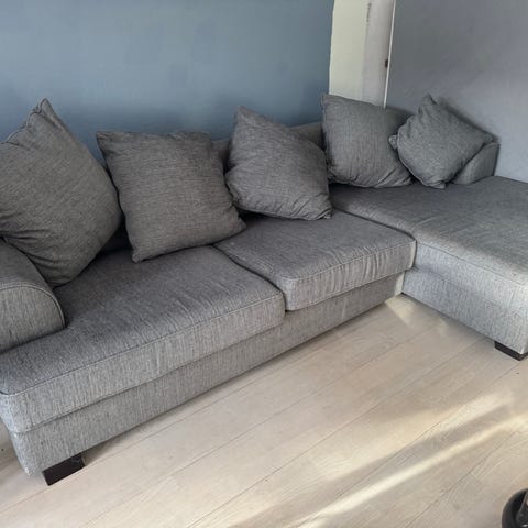 Det er samlet en pæn sofa hvor det blot er sæderne, som er gået i stykker. Ses ikke når puderne til ryggen står der.