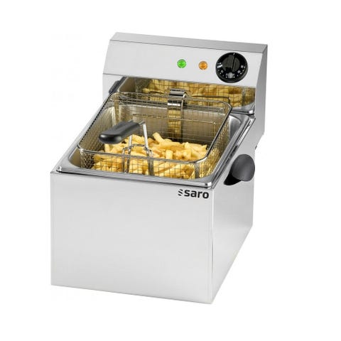 Med låg, aftagelig friturekurv med håndtag, temperaturregulering og indikatorlamper.