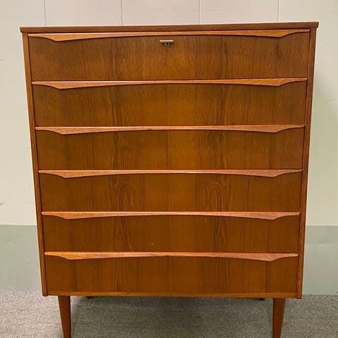Lækker gammel retro kommode i taek fra 1960erne. Kommode med 6 skuffer. Skufferne kører rigtigt godt. Fremstår i super stand. Evt kan lev aftales.