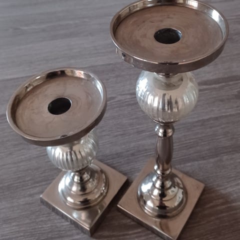 Lene Bjerre lysestager i metal. Sættet består af to ens lysestager med kvadratisk fod og profileret, riflet skaft. Overfladen er i blankt metal, og bunden er markeret med Georg Jensen-stempel. Velegnet til brug som bord- eller dekorationlysestager i hjemmet.