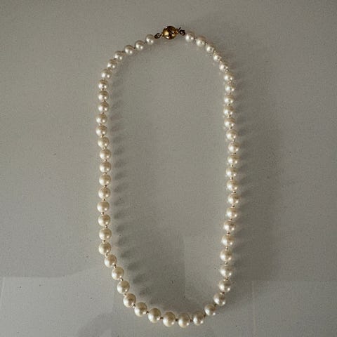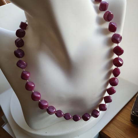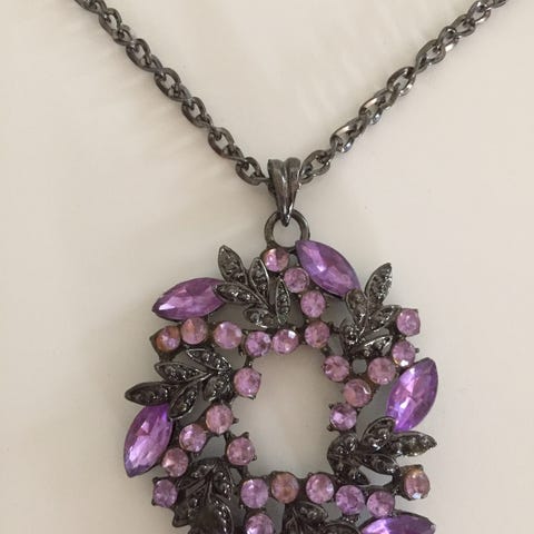 Halskæde med lilla perler i forskellige nuancer. Brugt 2 gange, i pæn stand. L: 56 cm.