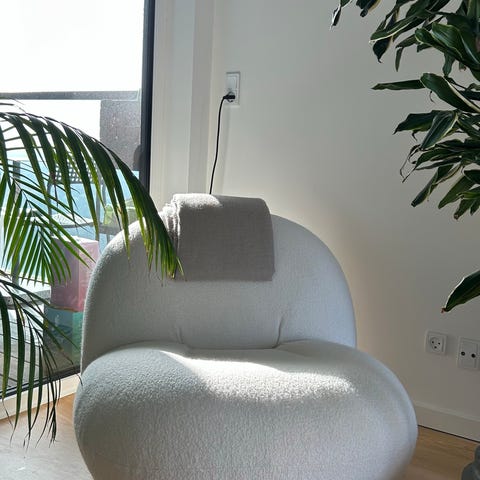 Har denne super flotte Gubi Pacha stol med armlæn. Står i en hvid / cremet hvid stof. Den har også dreje base.