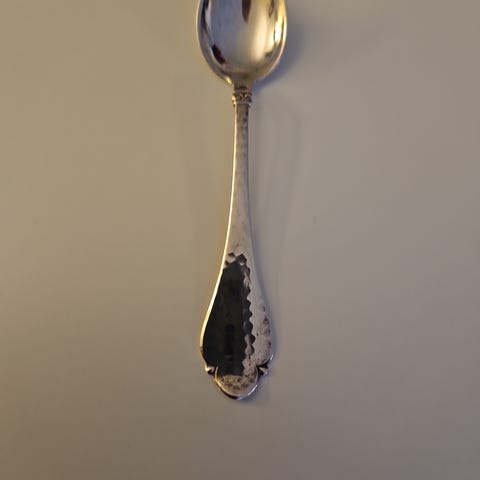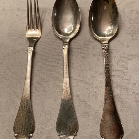 Smukke hammerslåede skeer i det klassiske Bernstorff‑mønster.
